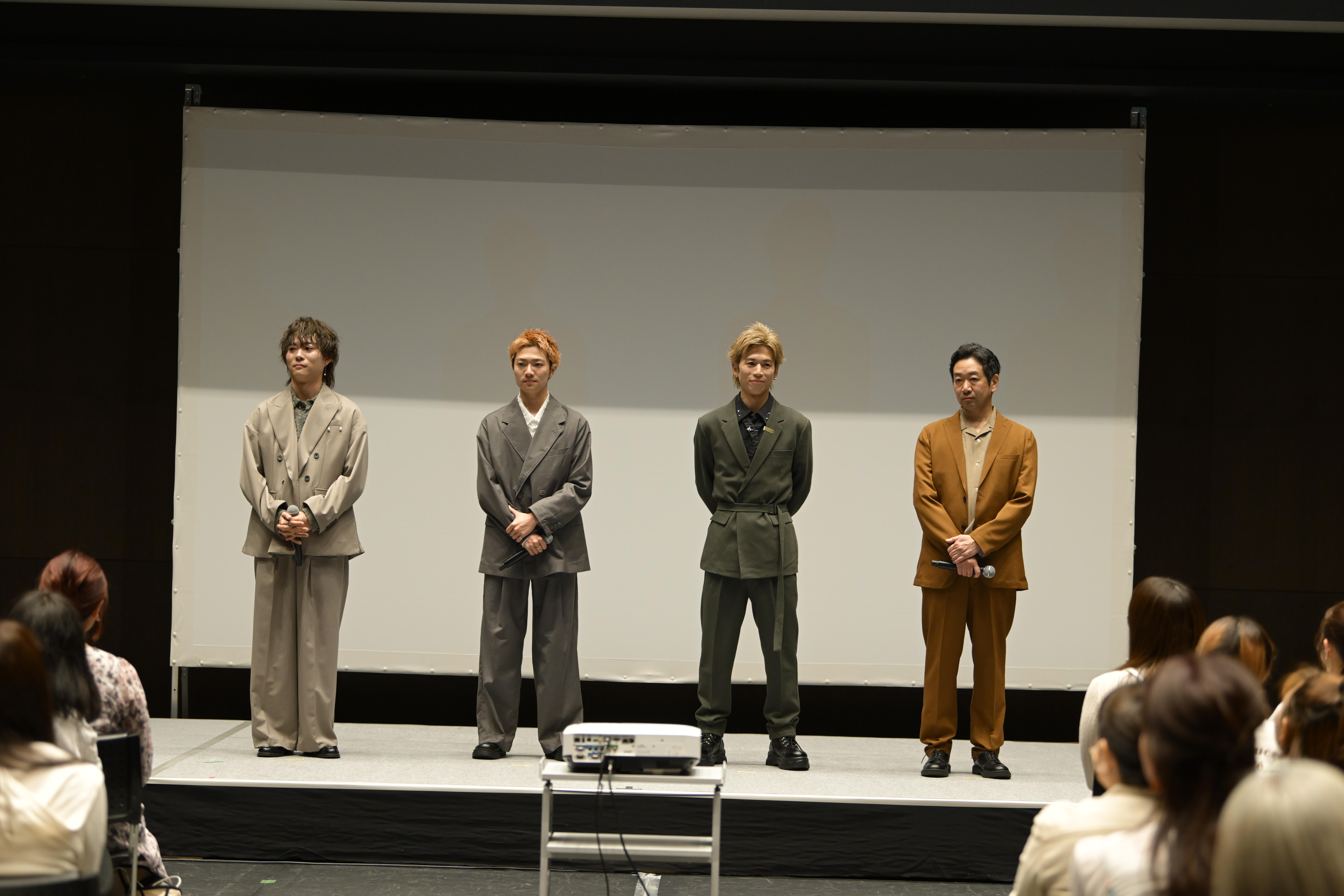 会場がほぼ⼥性に埋め尽くされた映画「熊本の彼⽒」の舞台挨拶には、TikTok ⼈気アカウント「熊本の彼⽒」こと杉本琢弥さん、熊⾕祐紀さん、諸星翔希さん、⼩⼭銀次郎さんが登壇。熊本地震からの復興に⼒を注ぐ熊本を舞台にする、杉本さんの楽曲をモチーフとしたオリジナルストーリーとなる本作について、撮影の様⼦から、⾳楽やダンス、役作りまで幅広いトークで観客の興味を惹きつけました。