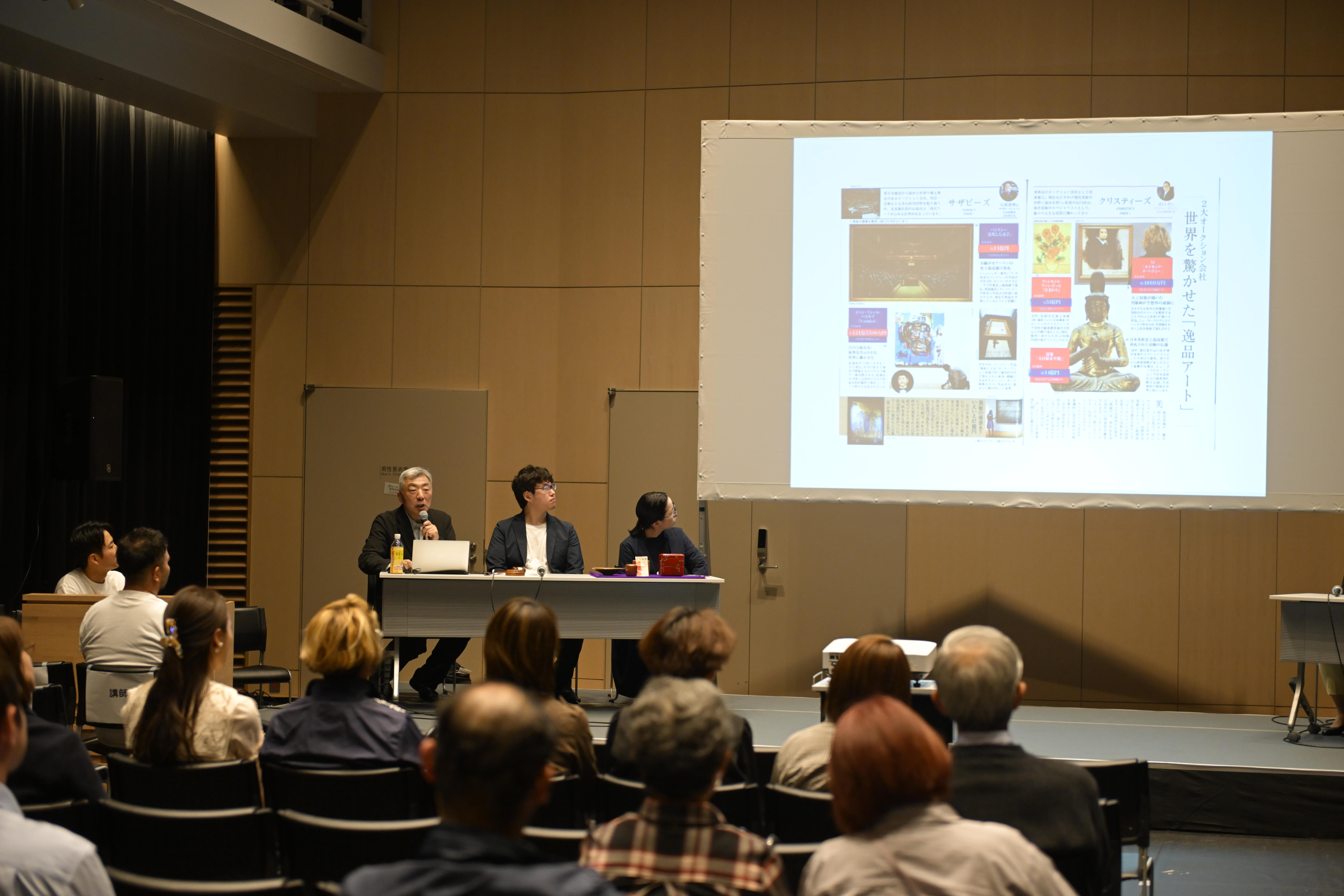 特別プログラムとなった柴⼭哲治さんによる「オークショニアスクール」では、オークションの基礎知識の座学とともに、地域に埋もれたお宝や地域アーティスト作品など、発掘した「モノ」のほか、それぞれの地域ならではの「コト」を販売する仕組みとしてのオークション事例を学び、観客も参加して実際にオークショニアとしての経験を積む機会が設けられました。