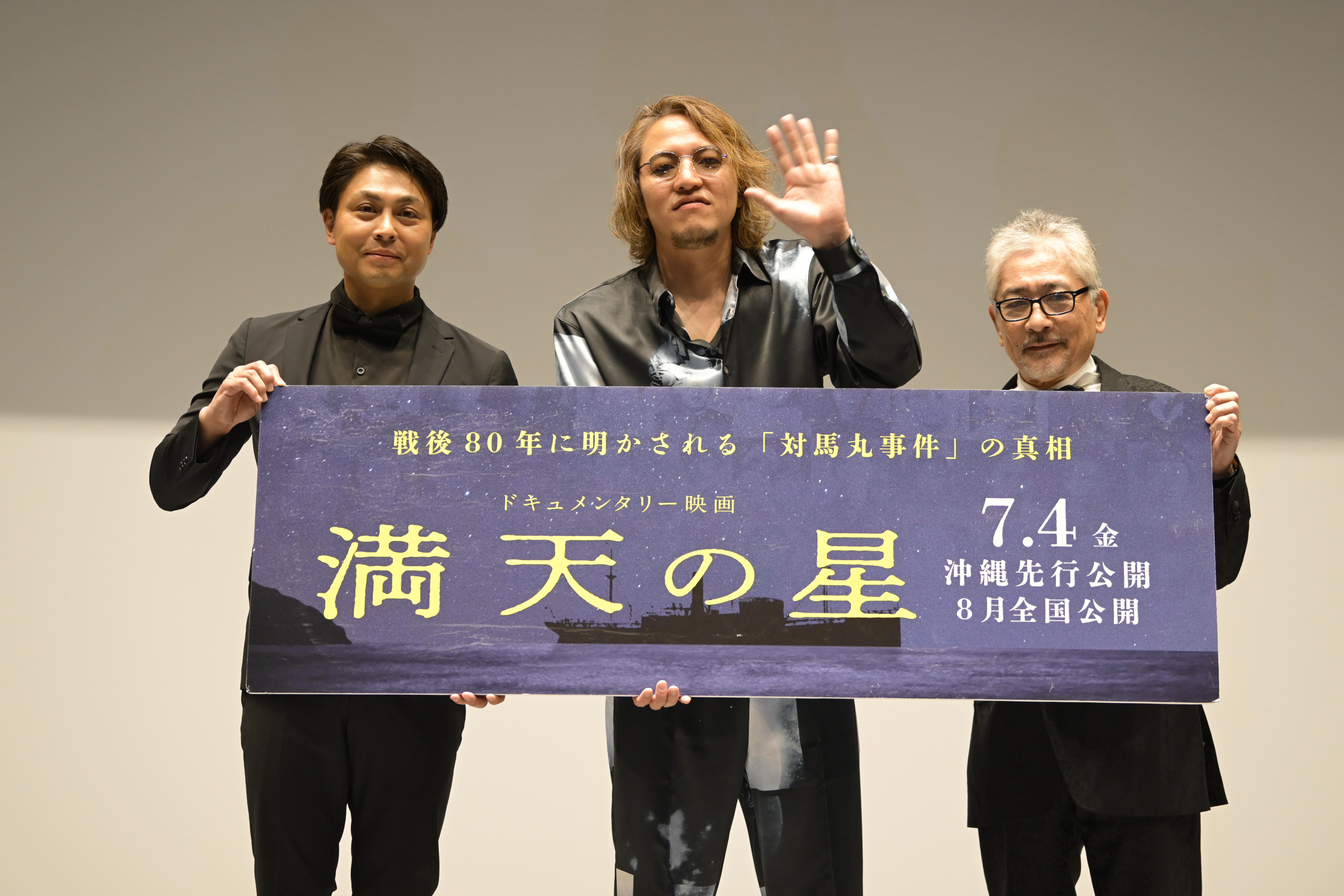 映画「満点の星」の舞台挨拶には、制作、主演、監督を務めた寿⼤聡さん、共同監督の葦澤恒さん、エグゼクティブプロデューサーのジェームス⽂護さんが登壇。過去と現代をつなぐことで戦争の恐ろしさとその影響を次世代に伝えるドキュメンタリーとなる本作について「平和とは具体的に何なのかということを、イメージとして論理的に意識できるようにすることが重要です」(ジェームス⽂護さん)と話しました。